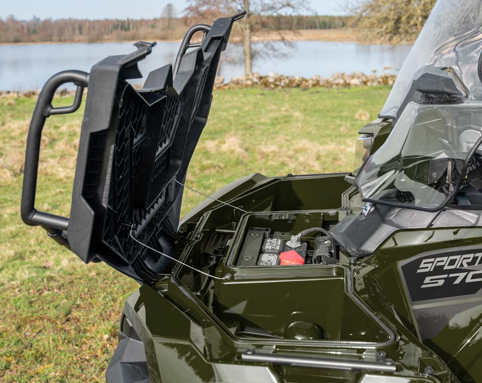 - Front Trail Bumper, Front Rack Extender, Rear Rack Extender, 12 Volt Power Plug, Pre-Wired for Hand & Thumb Warmers, In Pod Battery Charger, Winch Mount Included, Front A-Arm Guards